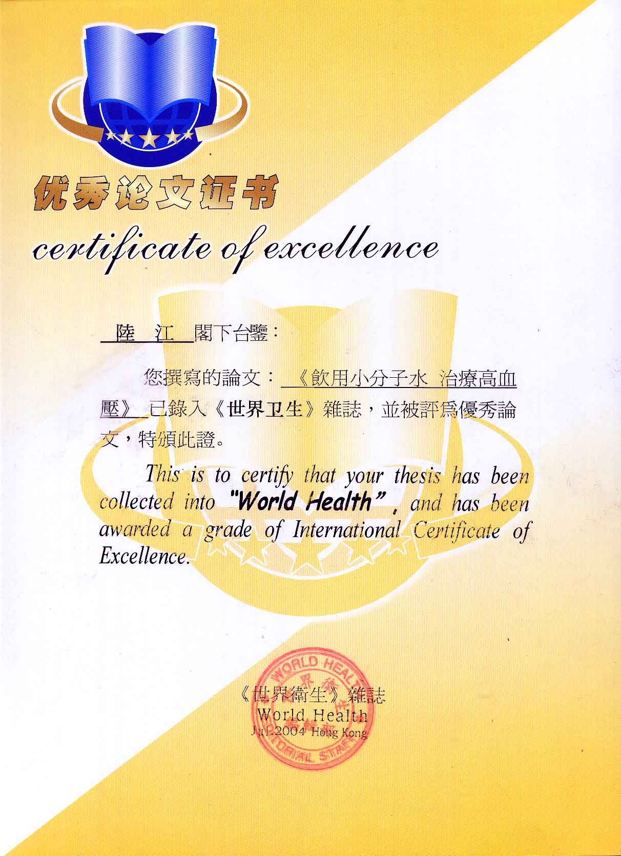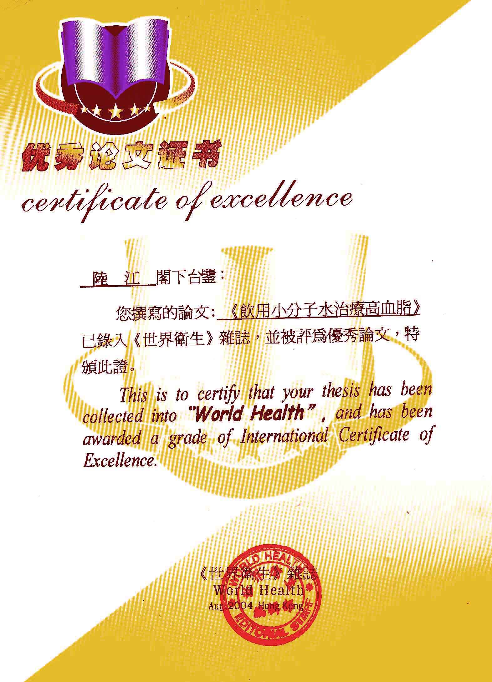 一.发明的亮点是中国基础医学研究成果的转化医学应用------------------------------------------------------------------------------------ 1990年春,我50岁,发现患了高血压,便及时遵医嘱服药。我想起父辈、祖辈曾患高血压,后来都患中风瘫痪或心梗过世,所以心中压力大。我梦想能根治高血压,便研究医学。当我检索到中国基础医学研究成果,采用高脂餐和磁处理小分子团水饲喂小白鼠或大白免等两组哺乳动物,经过2、4、6个月剖杀血检,发现饲喂小分子团水的试验组动脉内壁干净,能减轻和延缓动脉粥样硬化。我从这些研究成果受到启发。觉得有责任研制出优良的器具,让天下人能真正治愈高血压,消除动脉粥样硬化,延年益寿。于是,1990年我做成样品,先后与爱人饮用两三个月,分别治愈了高、低血压,之后我们的血压都正常,症状消失。该水经南京大学做核磁共振检测为55.82赫兹的微小分子团水。该品经工业开发后,1994年送给广西三家三甲医院做临床试用4个月,再经北京和广西医学专家鉴定认为:“降脂降压效果好” ,“能扩大心脑动脉流量,改善心脑电图和微循环” ,“对治疗心脑动脉粥样硬化、高血压、高血脂有良好的医疗保健作用”。1996年产品获得中国发明专利权。这就使产品可以转化为医学应用,人类可逐渐改变终生服药,自己祛除病症。