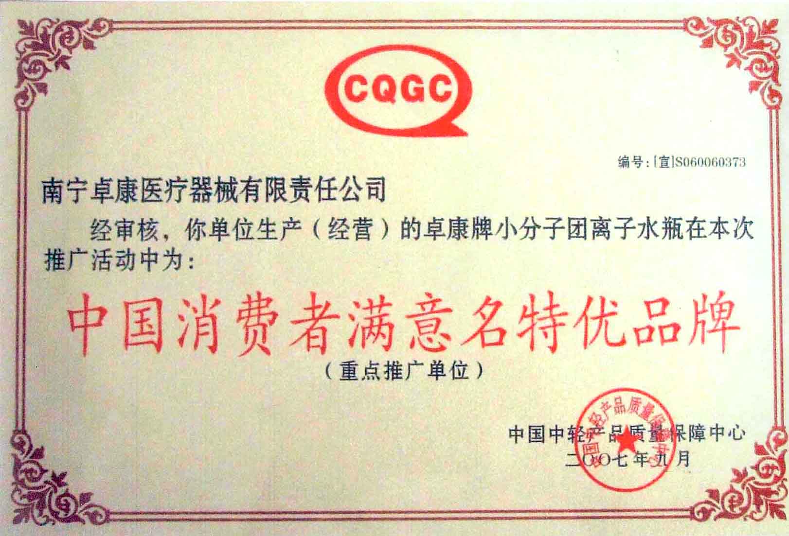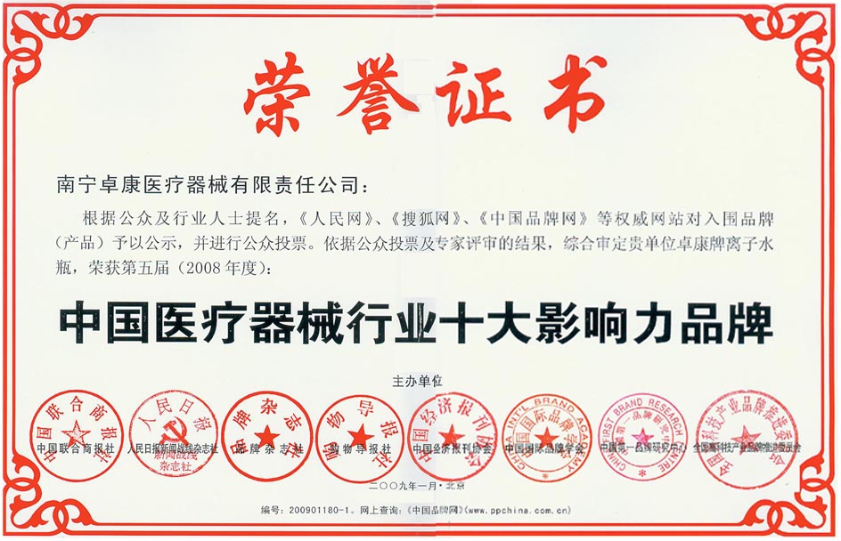 卓康牌离子水瓶荣获中国名特优品牌[点小图见大图] *荣获中国医疗器械行业十大影响力品牌[点小图见大图]--------
