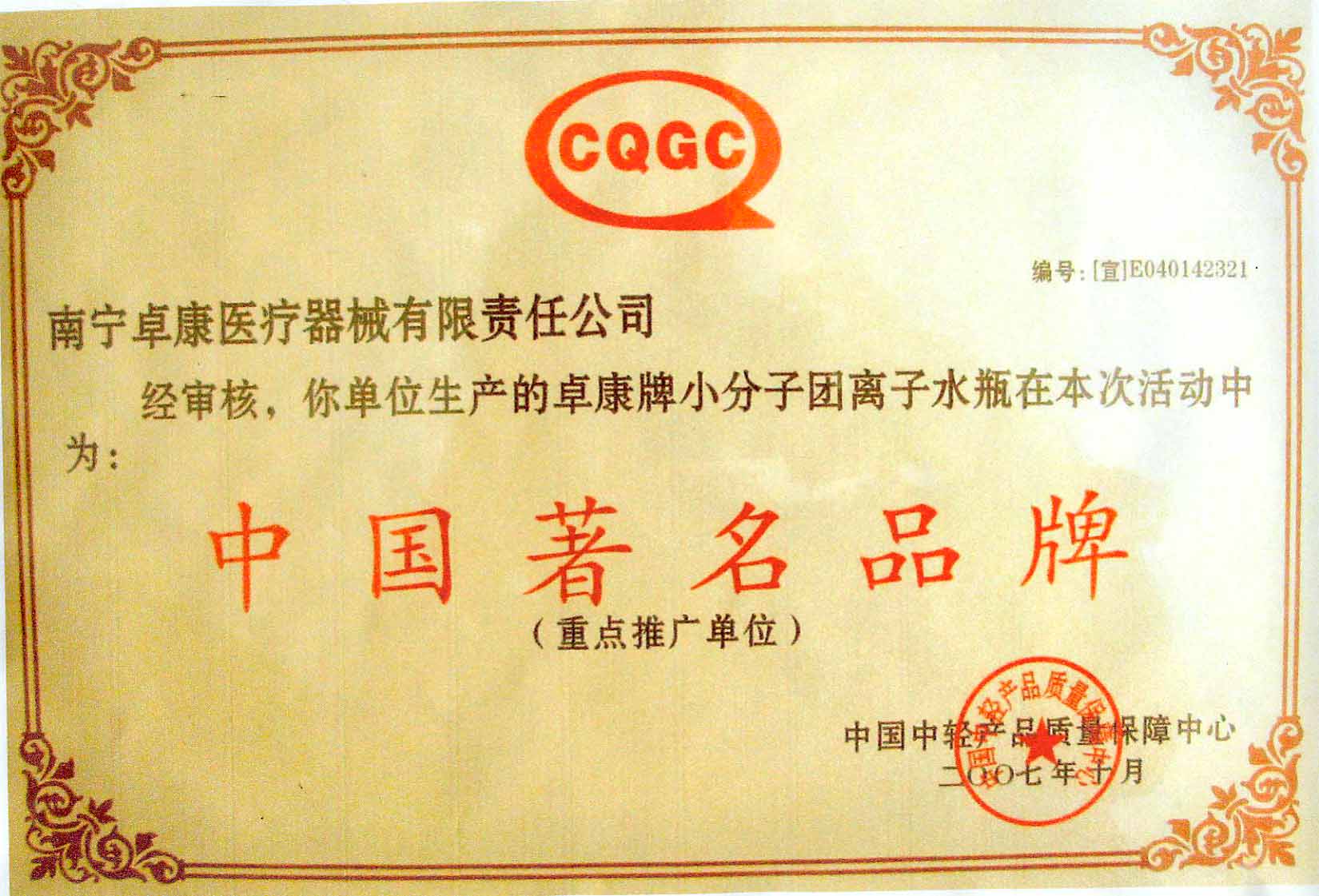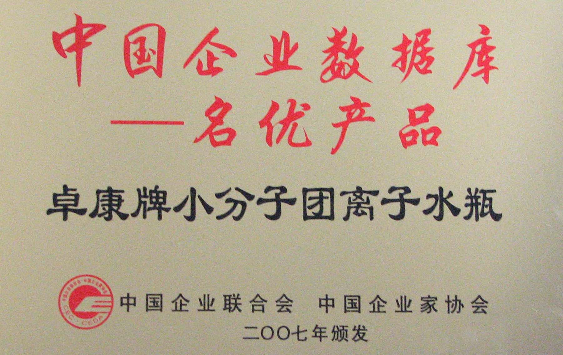 卓康牌离子水瓶荣获中国企业名优产品[点小图见大图]、中国著名品牌称号[点小图可见大图]