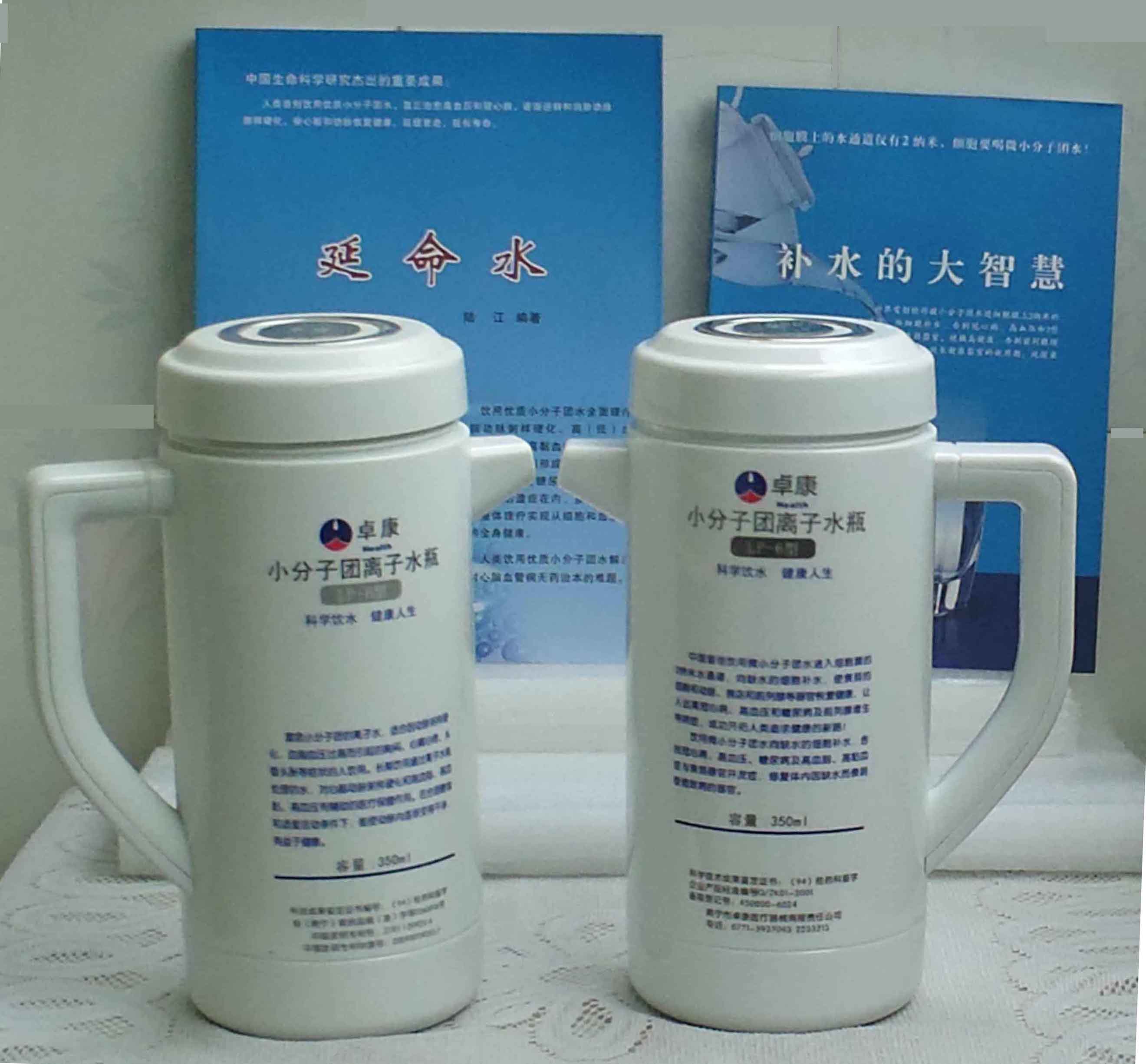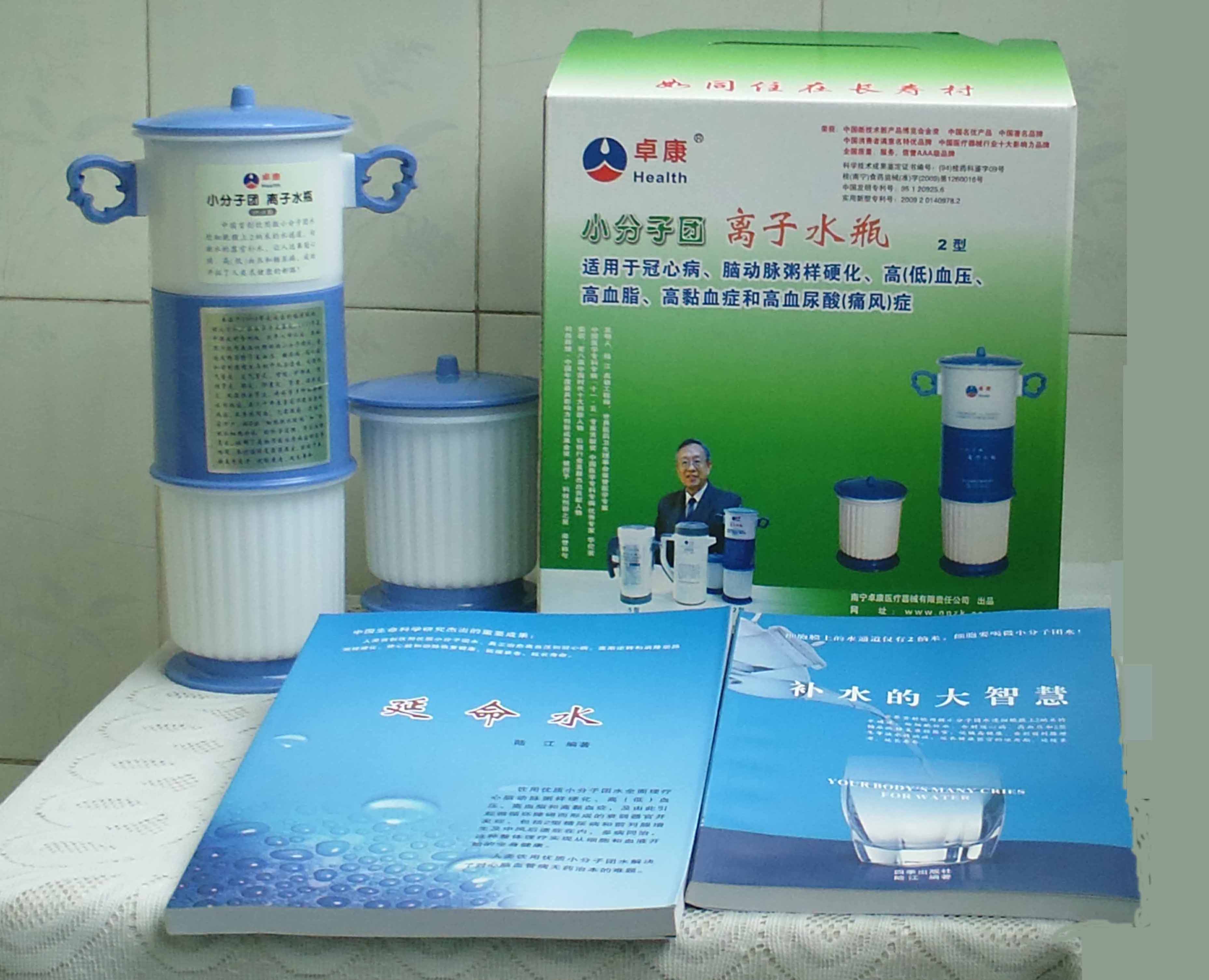 本品大量用户的使用效果表明,能治愈冠心病、脑动脉硬化、原发性高(低)血压、高血脂、高粘血症、高血尿酸症(痛风)和2型糖尿病、衰弱器官并发症(前列腺增生、肾衰与尿毒症)及中风后遗症等疗效好。产品配信誉卡。使用寿命30年,不换芯,易清洗。团购优惠。从邮局汇款,汇费1%,地址按本页下方地址、联系人写。从银行汇款,请点击[联系汇款]栏,。卓康牌离子水瓶为我公司独家生产,邮购产品配《补水的大智慧》彩印书一本,另配四季出版社出版的新书《补水的大智慧》一本,并配光盘一张(含央视主持人釆访陆江的对话视频)。目前市场和"淘宝网"上有人兜售假冒的伪品,望读者审察辩别真伪,造假者剽窃假冒本公司的各种认证、获奖奖项、专利号和外包装盒上的中英文字,包括科技成果的鉴定意见等,请读者注意防伪。如何识别假货?已经买了假货怎么办?(请点击[打假掠影][打假掠影])。