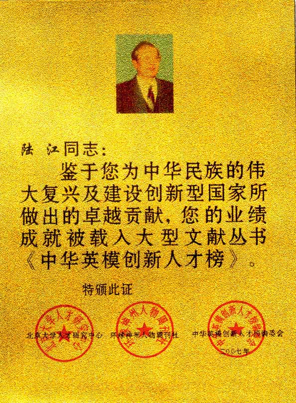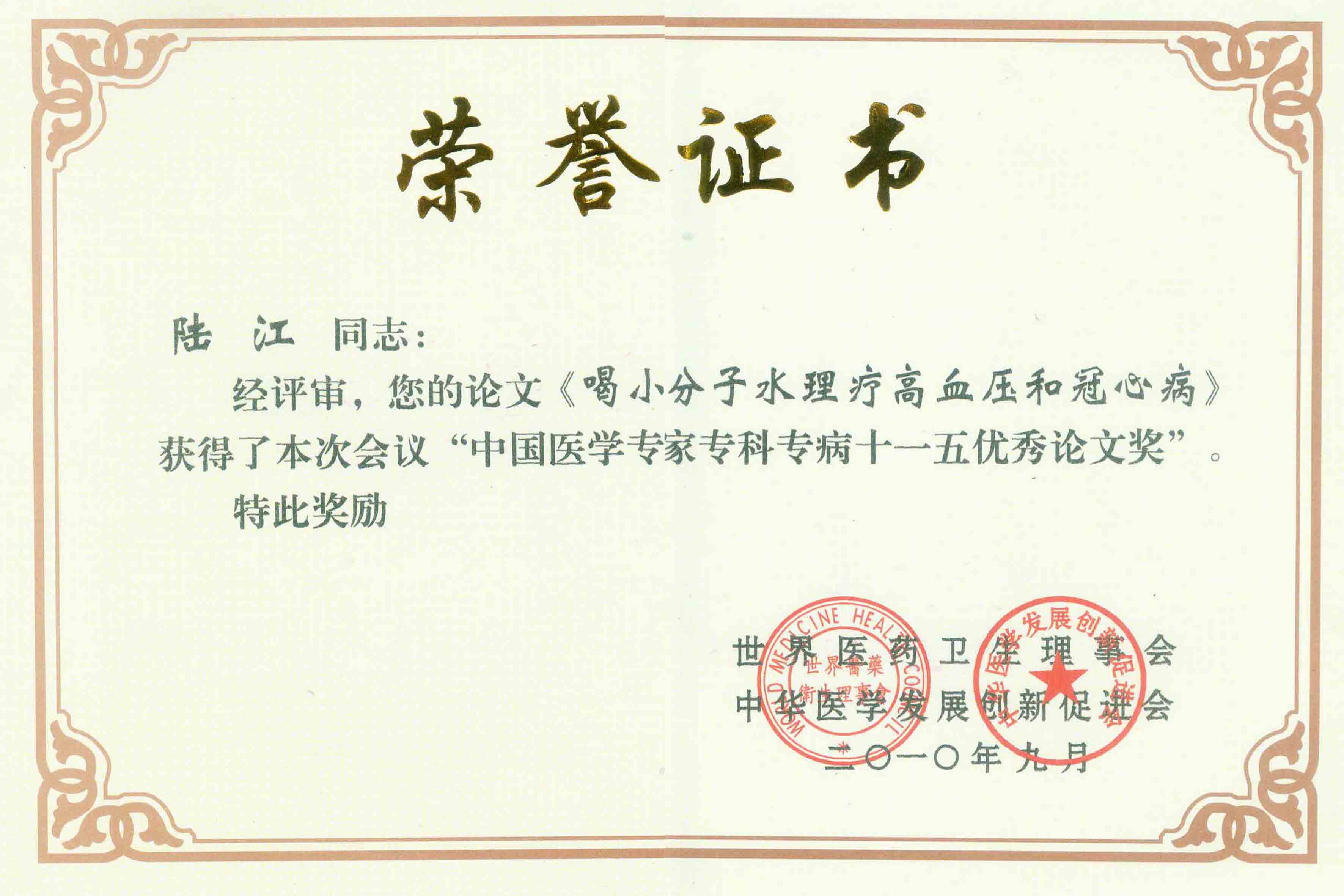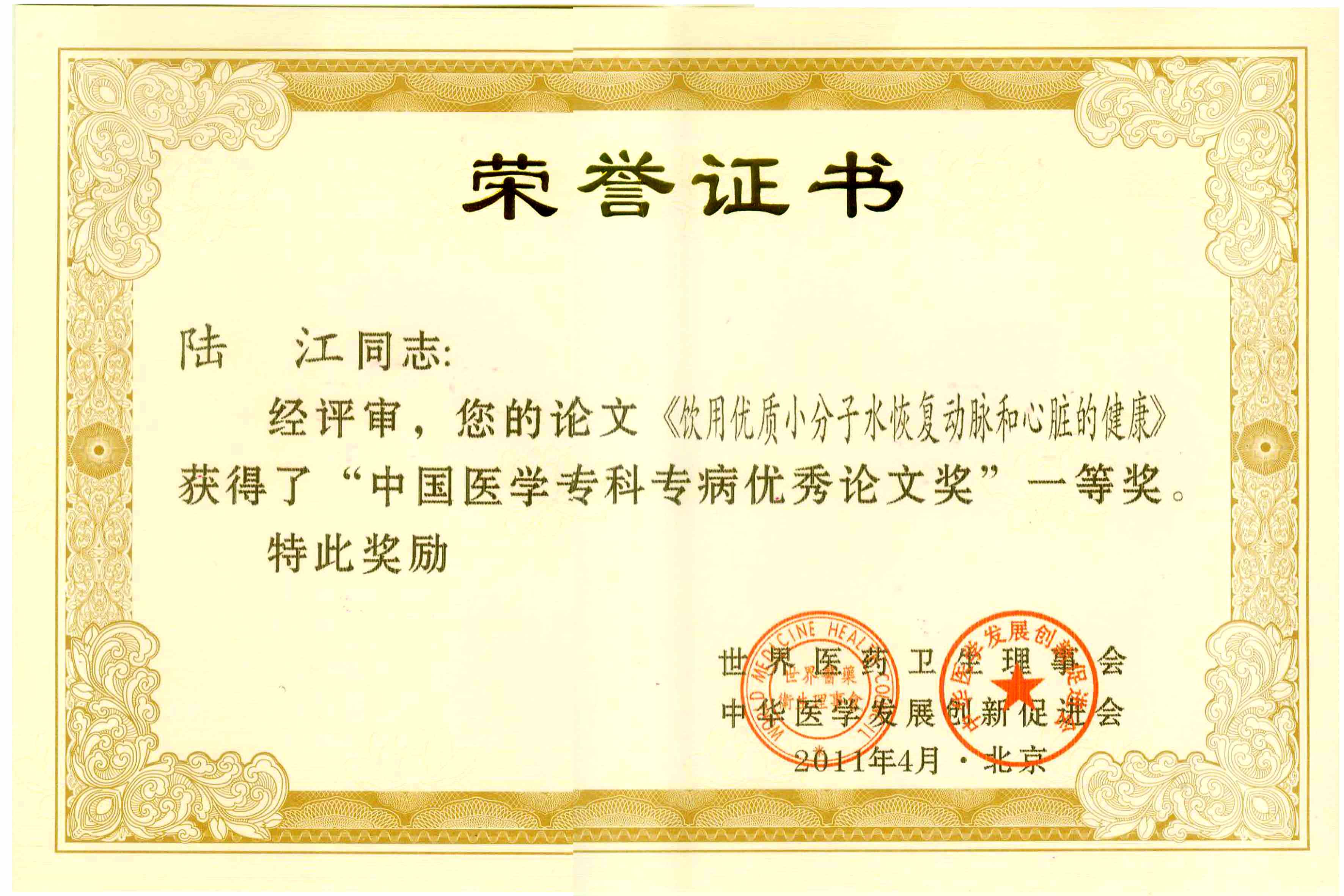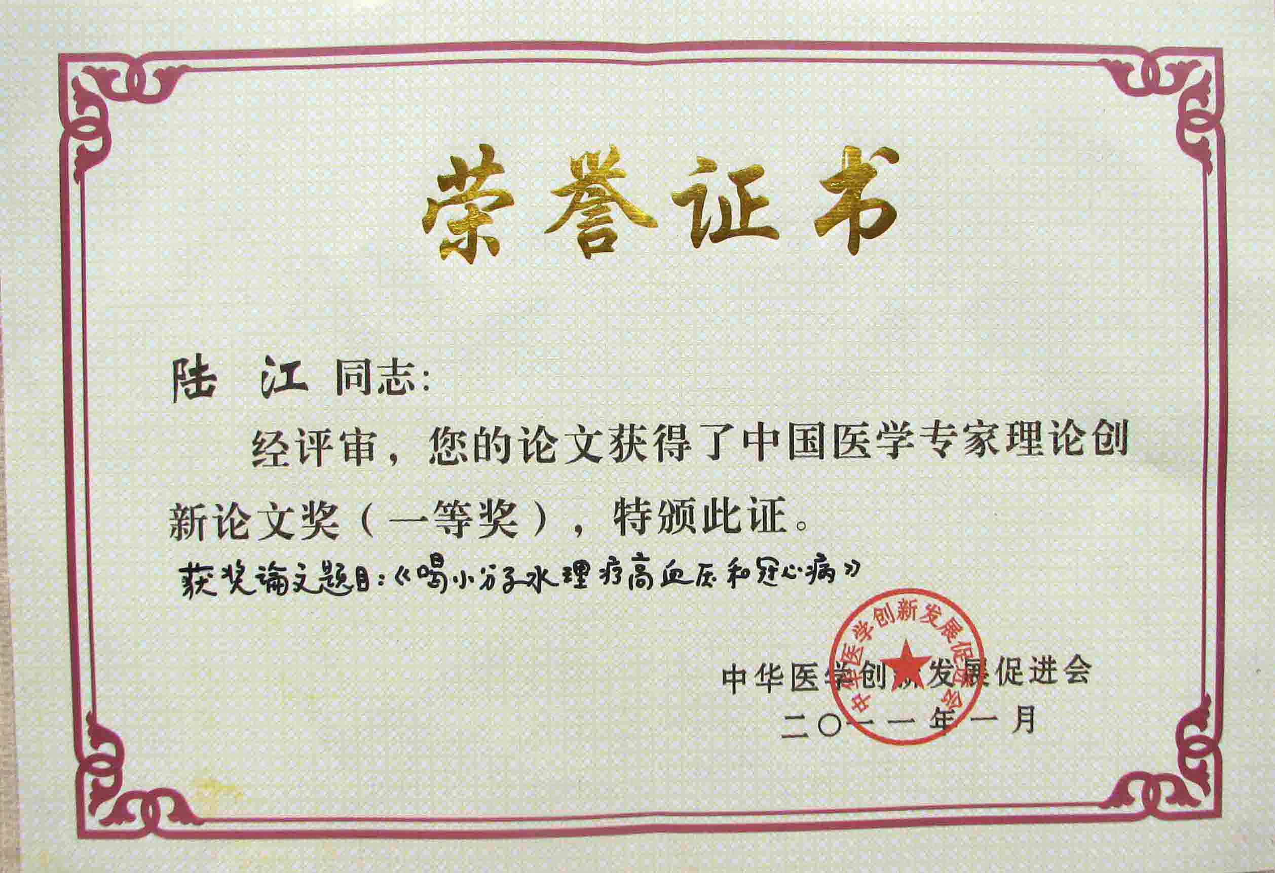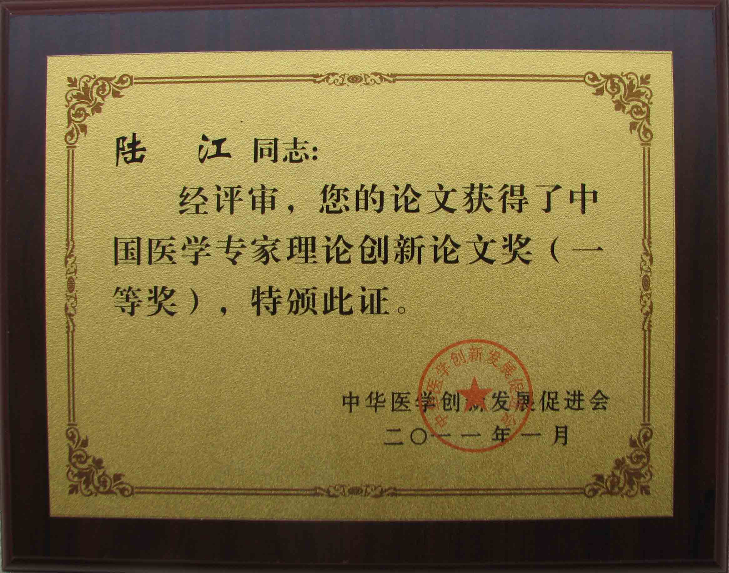 陆江的论文获一等奖荣誉证书-- 陆江论文获创新论文奖牌