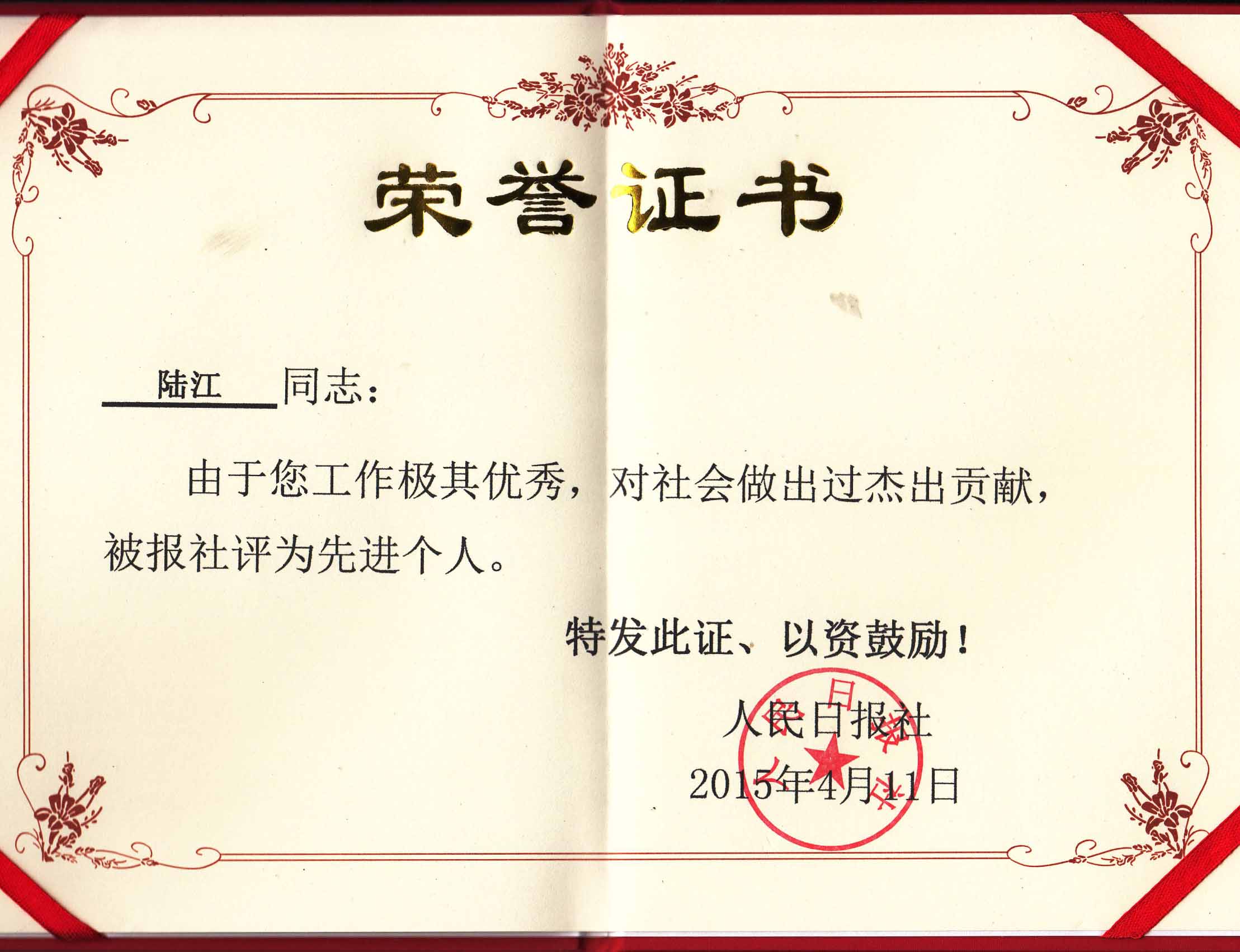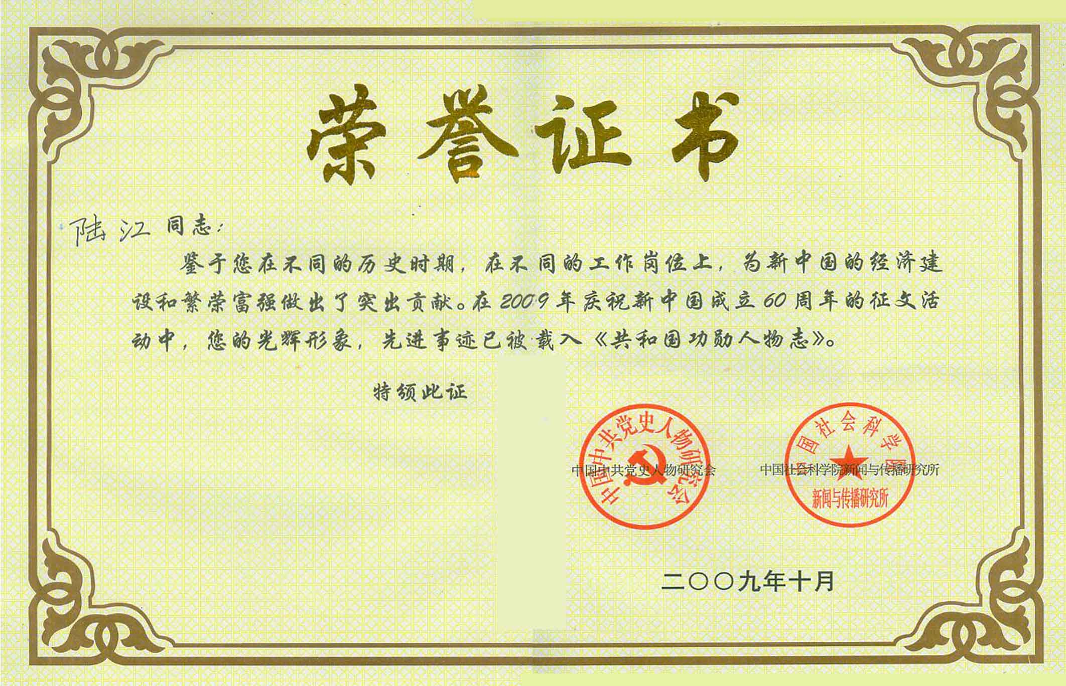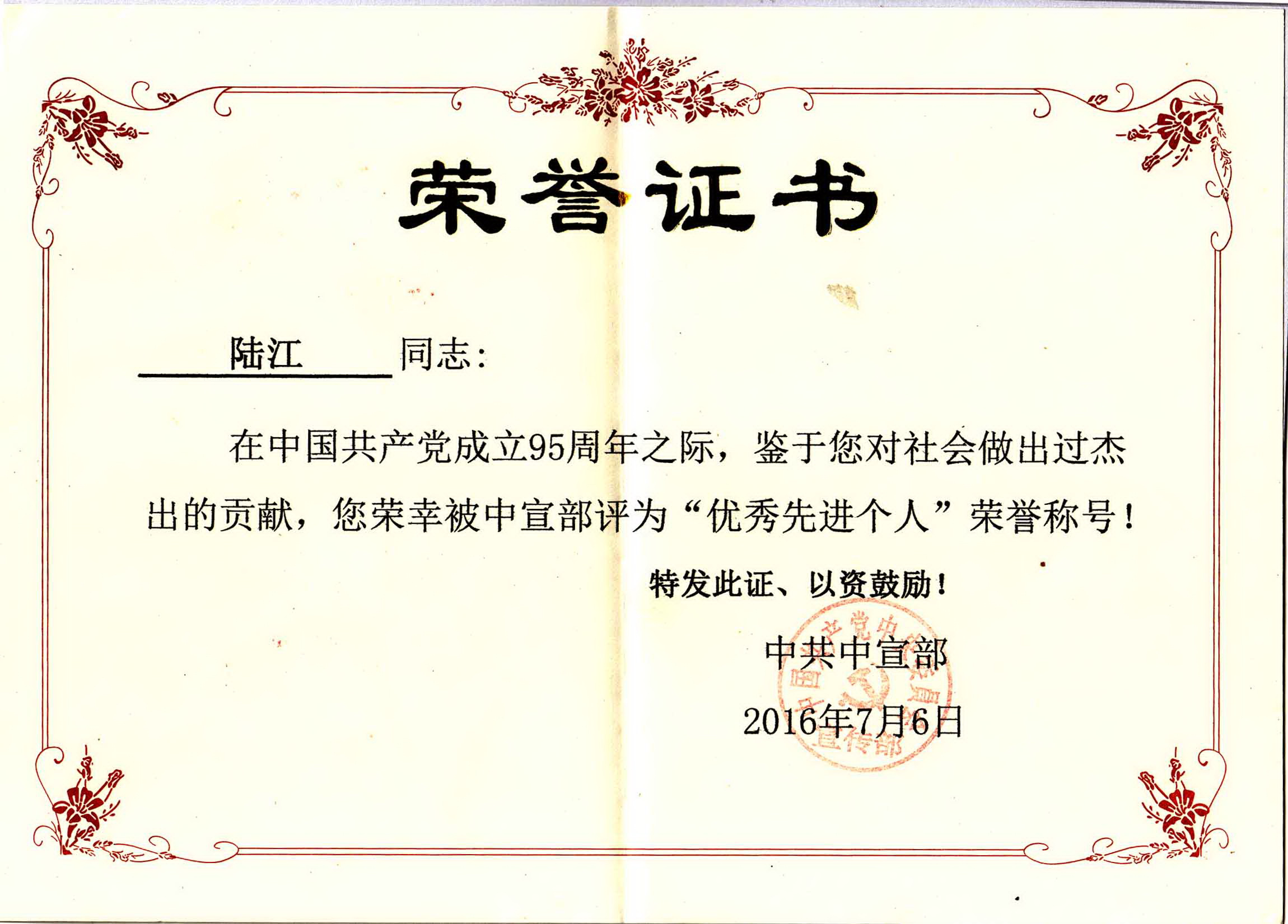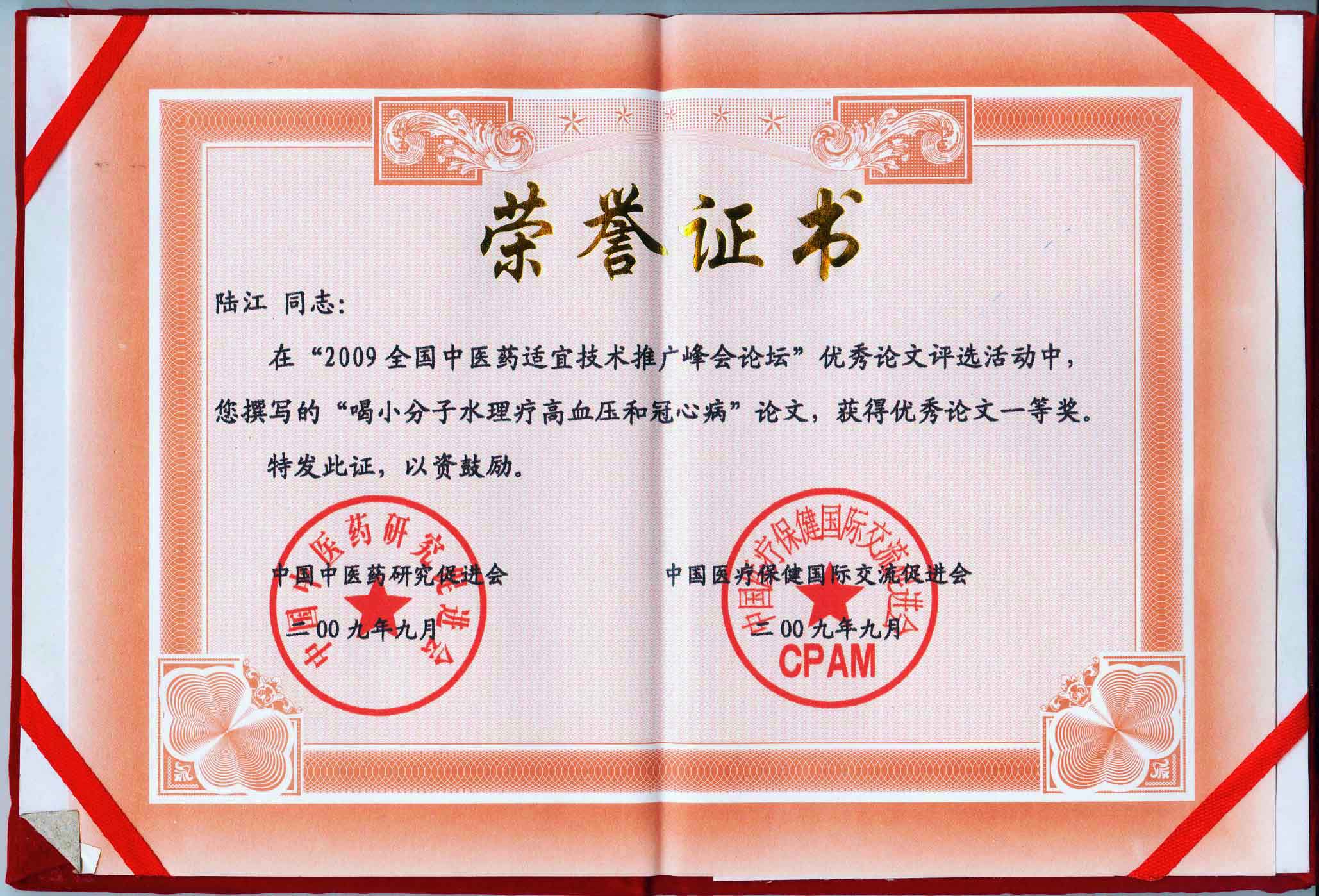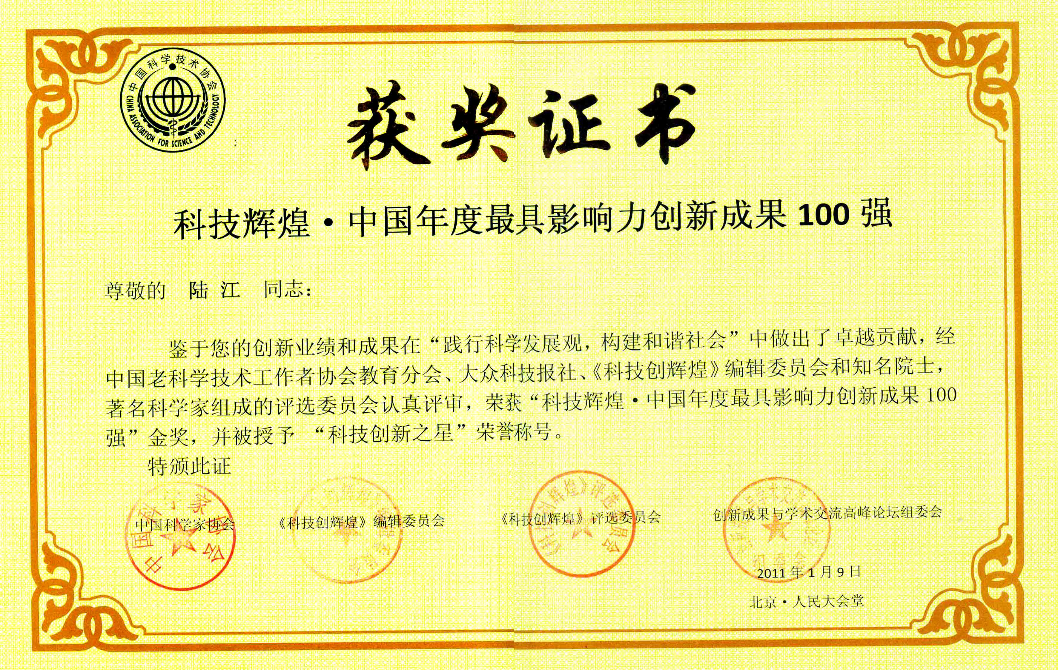 陆江的论文获一等奖荣誉证书-- 陆江论文获创新论文奖牌