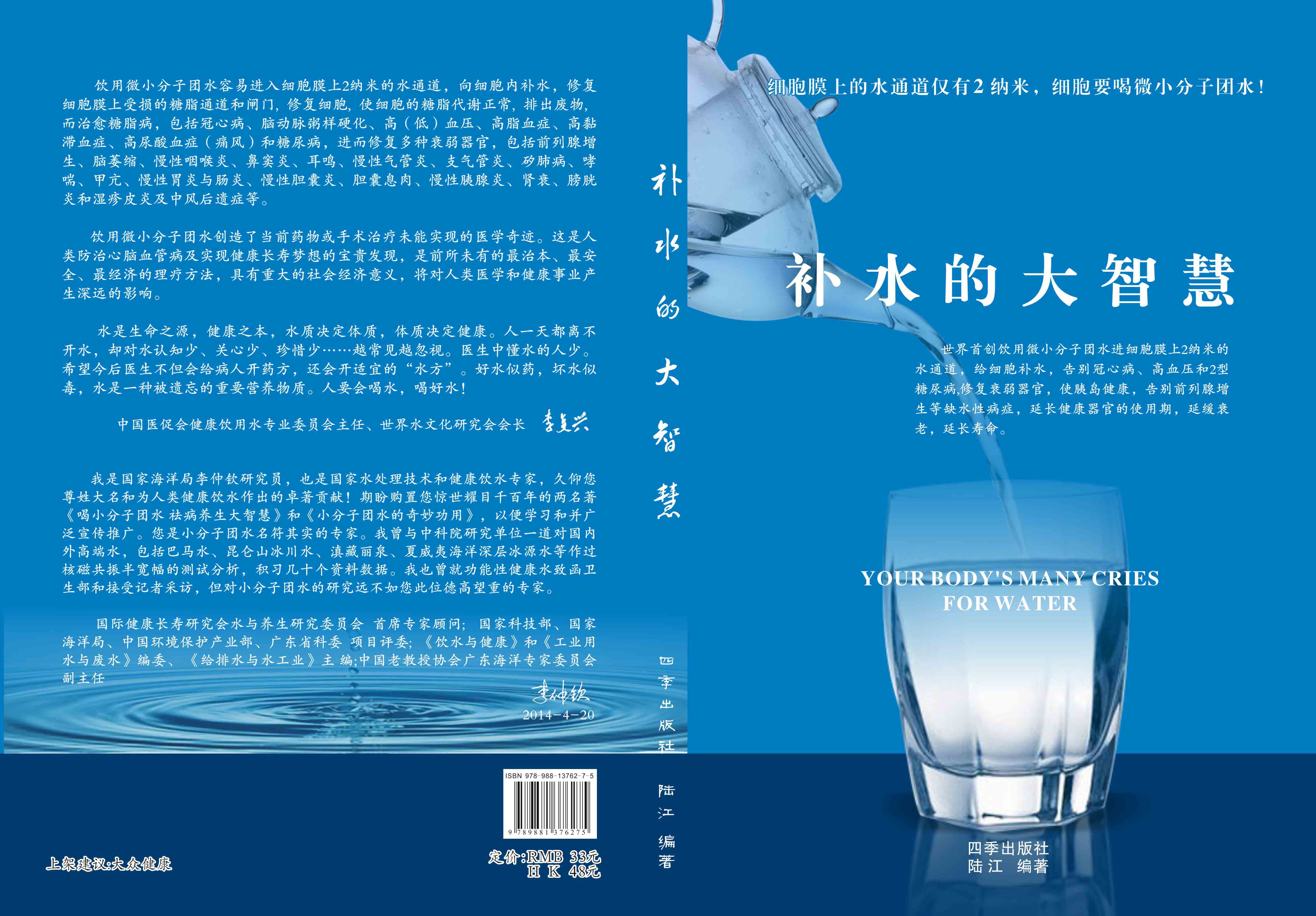 ----几千年来,人们感到口渴才喝水,误认为口渴是唯一的缺水信号,使喝水量偏少。很多人只知道补血补气补肾补钙补硒,而不知补水,逐渐使许多器官缺水,包括皮肤、动脉、气管、胆囊、肠胃、骨关节、肾脏、前列腺和胰岛缺水,以致患冠心病、高(低)血压和糖尿病等缺水性病症。美国F·巴特曼医学博士写有《水是最好的药》一书很受欢迎,我国2007年译成中文版,论述人体缺水引起许多病症,他指导3000多患者喝水治愈了哮喘、胃炎和高血压等病症。而我是从2000年起,让患者饮用微小分子团水,因为容易进细胞膜上2纳米的水通道,治愈了许多缺水性的病。我跟踪调查14年,发现凡是认真饮用和合理膳食,可治愈冠心病、高(低)血压和2型糖尿病与衰弱器官并发症及中风后遗症。高血压患者饮用2~5个月,症状消除,不再服药,逐渐逆转至消除动脉粥样硬化,血压正常稳定,治愈了高血压;冠心病人饮用3~5个月,消除心绞痛、房颤等症状,不再服药,一年左右心电图正常,经冠状动脉造影扫描表明冠脉内无粥样斑块,真正治愈了冠心病;2型糖尿病人饮用3~10个月停药,血糖尿糖正常,糖尿病痊愈。并且使前列腺增生、慢性咽喉炎、鼻窦炎、耳鸣、慢性气管炎、支气管炎、哮喘、矽肺病、慢性胃肠炎、胆囊炎、胰腺炎、肾衰、膀胱炎、风湿性关节炎、便秘、痔疮和湿疹皮炎等不药而愈,而无需终生服药。饮用微小分子团水治愈的是长期吃药治不好的病,弥补了几千年来医药的欠缺,成为人类健康的宝贵资源。