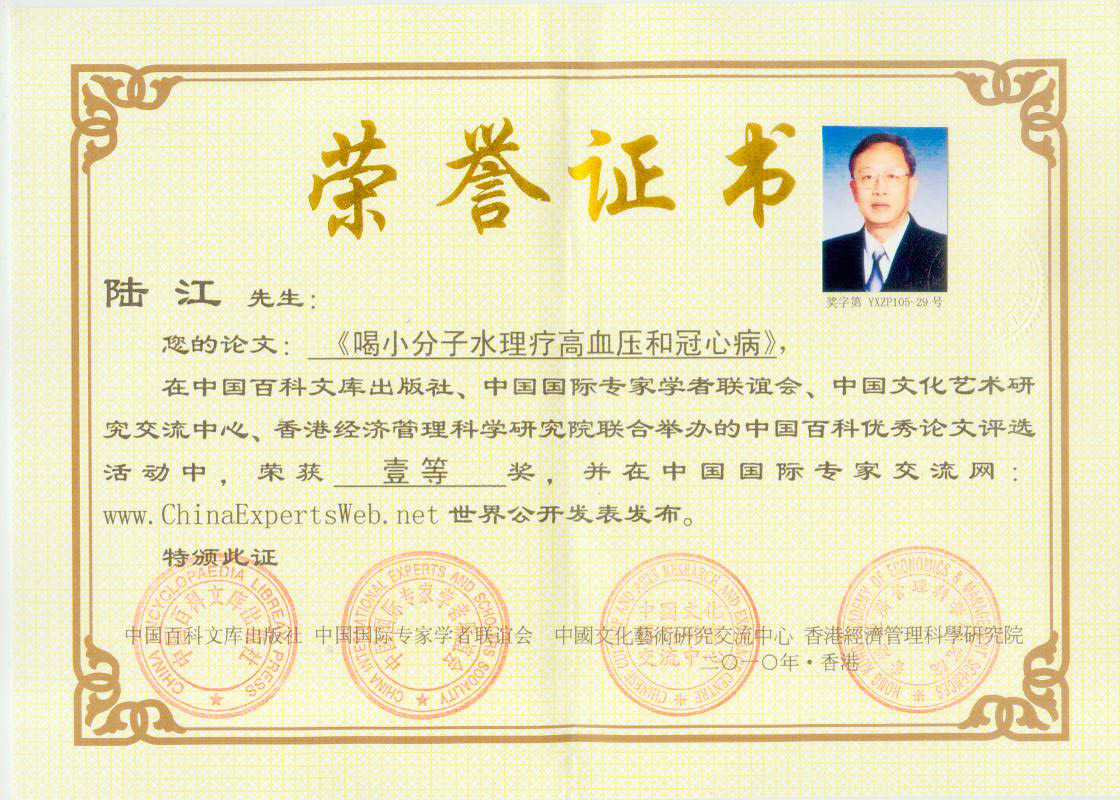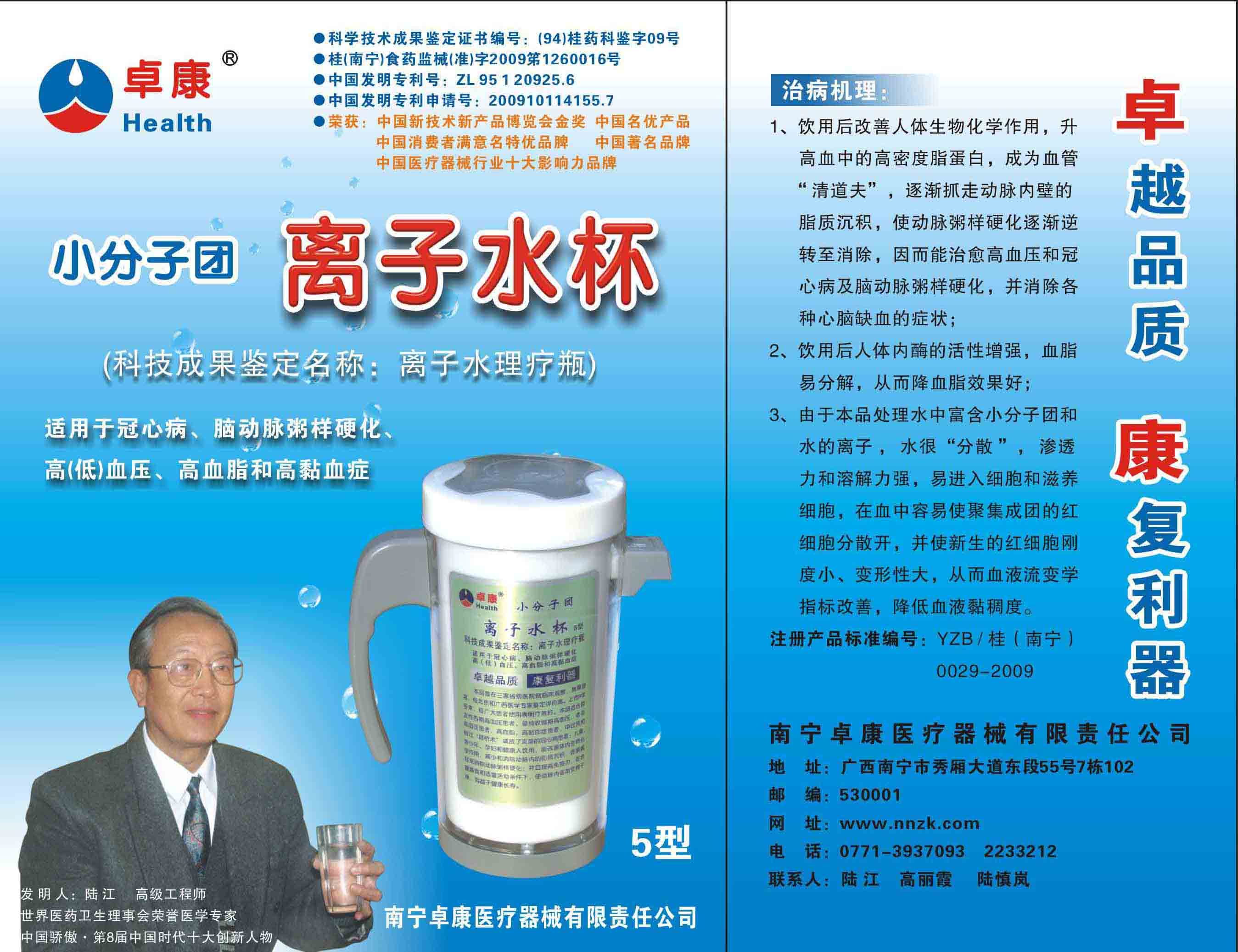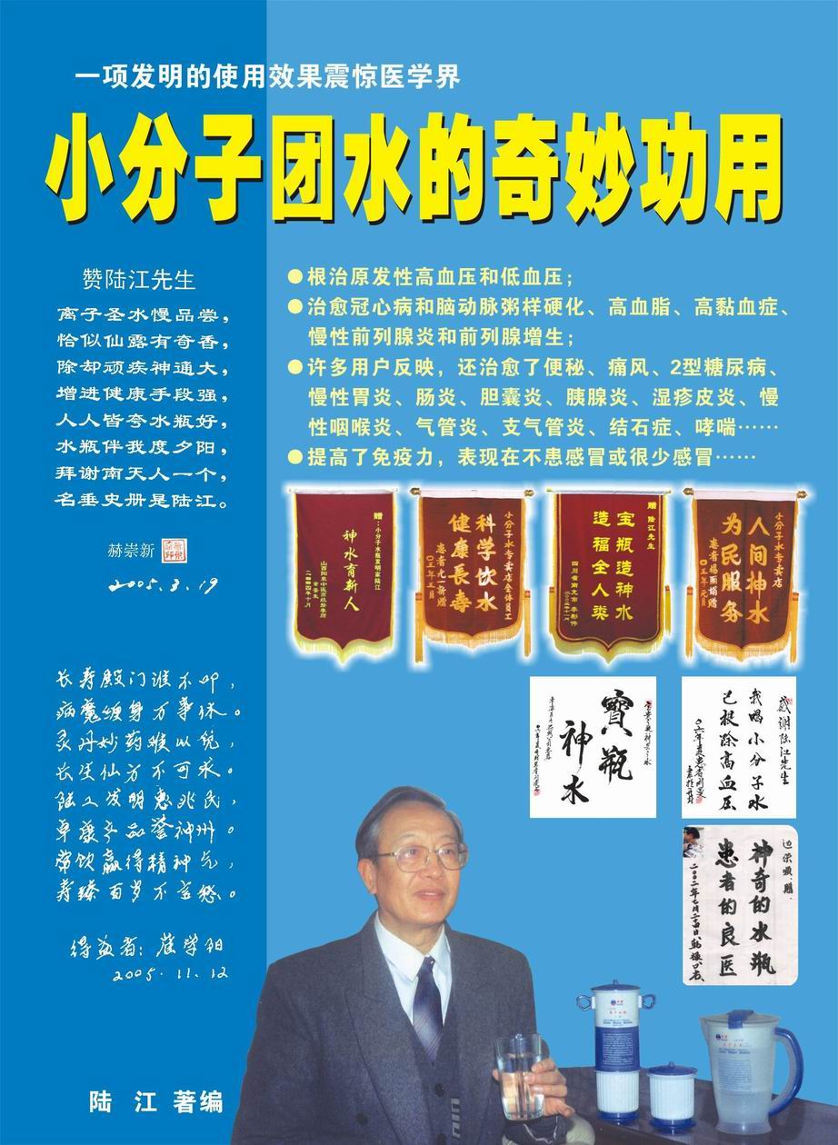 -----我是从事建筑的高工,本来没有资格去攻克医学难题,却为了自身健康才扣响医学的大门。由于我1990年患高血压,因怕中风才研究发明了离子水瓶,我把水处理成微小分子团水,饮用后治愈了高血压。便于1993年底送到三家省级医院做临床试用4个月。经北京和广西医学专家鉴定:"降脂降压效果好"," 能扩大心脑动脉流量,改善心脑电图以及微循环","对治疗心脑动脉粥样硬化、高血压、高血脂有良好的医疗保健作用。""产品的技术性能和疗效达到了同类产品的国内领先水平,经广西医学科学情报研究所检索,未见国外有类似报道。"中国医学科学院张正国教授从美国国立医学图书馆数据库存Medline检索英俄文资料,均未见类似报告。2000年上市后,我为了对消费者负责而继续观察研究,一直通过《信誉卡》和《质量跟踪调查书》向患者承诺疗效,请用户使用6个月后反馈效果。和脂压患者饮用2至5个月内,消除症状,停服药物,血压正常;冠心病患者饮用3~5个月逐渐减轻至消除心绞痛、房颤等症状,不再服药,饮用1年左右心电图正常,经冠脉造影扫描无明显狭窄,表明冠心病痊愈。大量患者还反映许多衰弱器官被修复,让前列腺增生、慢性咽喉炎、慢性气管炎、支气管炎、慢性胃炎、肠炎和胆囊炎等不药而愈;2型糖尿病患者是因为胰岛衰弱致病,饮用该水半年至一年,逐渐减药至停药,血糖尿糖正常,真正治愈2型糖尿病。中风后遗症患者饮用六七个月,可逐渐减轻至消除肢体和语言障碍,表明饮用该水能让寿命很长的神经元细胞逐渐修复,奇迹般地恢复肢体和语言功能。饮用后还使胸腺和脾脏两个重要的免疫器官被修复和增强,产生免疫细胞多,提高了免疫力,使人不生病或少生病。自此, 饮用微小分子团水创造了攻克冠心病、高(低)血压和糖尿病三大医学难题的奇迹。人们对此感到不可思议,但实践是检验真理的唯一标准。